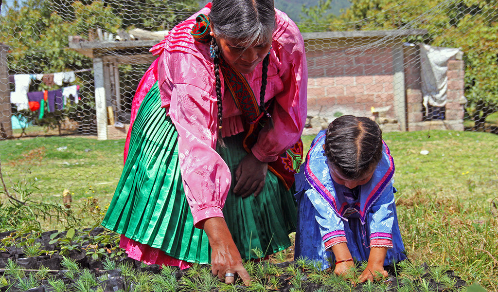 当地小区的一名妇女和儿童正在照料树苗,鸣谢Alternare A.C.提供相片。